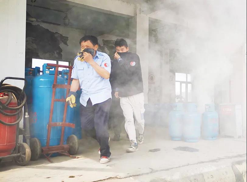 當(dāng)天下午,隨著一聲哨響,演練正式開始。只見充裝臺(tái)上煙霧彌漫,這是用發(fā)煙罐,模擬灌裝秤的皮軟管爆裂脫落,導(dǎo)致液化氣大量泄漏的情景。險(xiǎn)情就是命令,灌裝班長迅速指揮灌裝人員以衣物遮擋口鼻,快速撤離現(xiàn)場,避免人員出現(xiàn)窒息與凍傷。警戒組在門口拉起了警戒線,所有無關(guān)人員全部撤到警戒線之外,并嚴(yán)禁外來人員進(jìn)入現(xiàn)場。根據(jù)預(yù)案,搶修組人員手持銅制不發(fā)火工具組,沖上充裝臺(tái),第一時(shí)間切斷灌裝秤后快開閥,避免液化氣繼續(xù)外泄,打開防爆電扇與防爆排風(fēng)扇,迅速將液化氣濃度降低,隨后對相關(guān)皮軟管進(jìn)行更換,經(jīng)過氣體檢漏儀測試后,確定無泄漏。