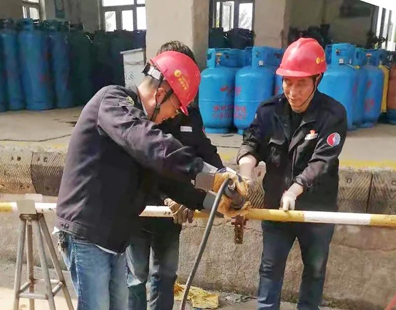 演練現(xiàn)場,通過用氮?dú)怃撈拷o相關(guān)管道加壓,模擬液化氣管道發(fā)生泄漏。只見法蘭連接處滋滋作響,帶壓堵漏組人員攜帶工具迅速趕到現(xiàn)場,在使用專用夾具固定住法蘭后,對其加注填料。經(jīng)氣體檢漏儀測試,管道法蘭處于安全狀態(tài)。