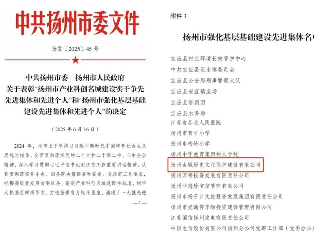 近日,揚(yáng)州市委、市政府印發(fā)《關(guān)于表彰“揚(yáng)州市產(chǎn)業(yè)科創(chuàng)名城建設(shè)實(shí)干爭先先進(jìn)集體和先進(jìn)個(gè)人”和“揚(yáng)州市強(qiáng)化基層基礎(chǔ)建設(shè)先進(jìn)集體和先進(jìn)個(gè)人”的決定》。揚(yáng)州古城歷史文化保護(hù)建設(shè)有限公司(以下簡稱“古保公司”)獲評“揚(yáng)州市強(qiáng)化基層基礎(chǔ)建設(shè)先進(jìn)集體”。