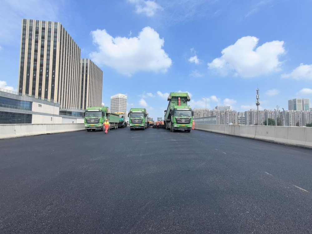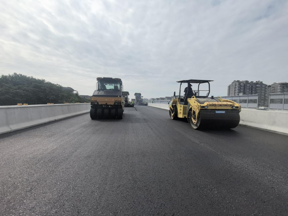 施工過程中,現(xiàn)場(chǎng)攤鋪機(jī)、壓路機(jī)等設(shè)備有序作業(yè),管理人員對(duì)原材料質(zhì)量、攤鋪溫度、厚度及平整度進(jìn)行嚴(yán)格控制,確保各項(xiàng)施工符合各項(xiàng)規(guī)范要求,為后續(xù)橋面交通標(biāo)志標(biāo)線施劃、智能交通監(jiān)控設(shè)施及亮化設(shè)備安裝打下基礎(chǔ)。