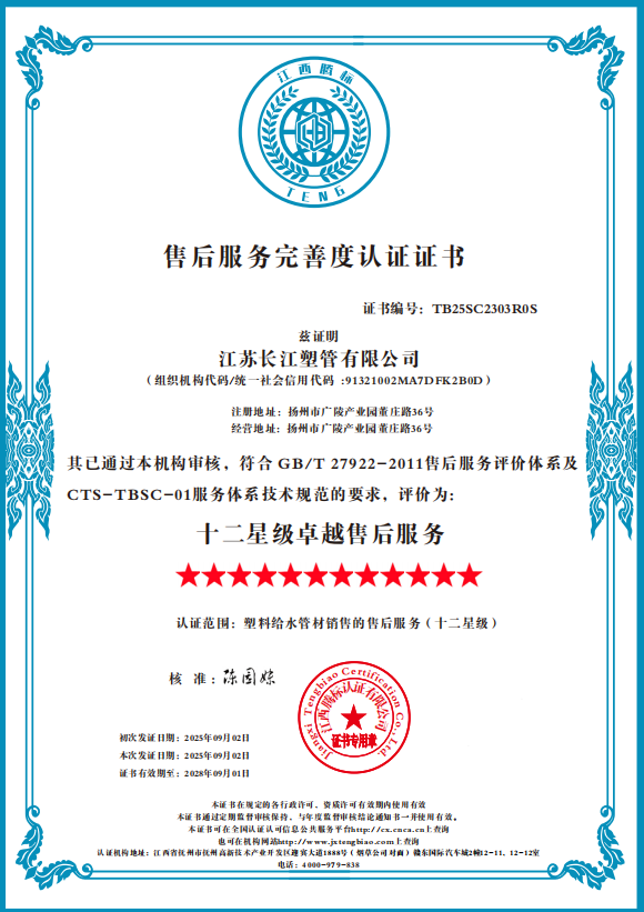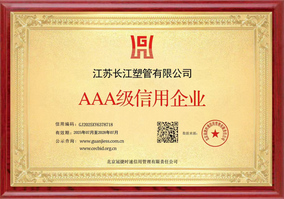 2025年,江蘇長江塑管有限公司接連榮獲AAA級(jí)信用企業(yè)蟬聯(lián)認(rèn)證與十二星級(jí)卓越售后服務(wù)評(píng)價(jià)。這兩項(xiàng)沉甸甸的榮譽(yù),不僅是國家權(quán)威機(jī)構(gòu)的高度認(rèn)可,更是企業(yè)全體員工在生產(chǎn)一線以汗水與擔(dān)當(dāng)書寫的奮斗答卷。