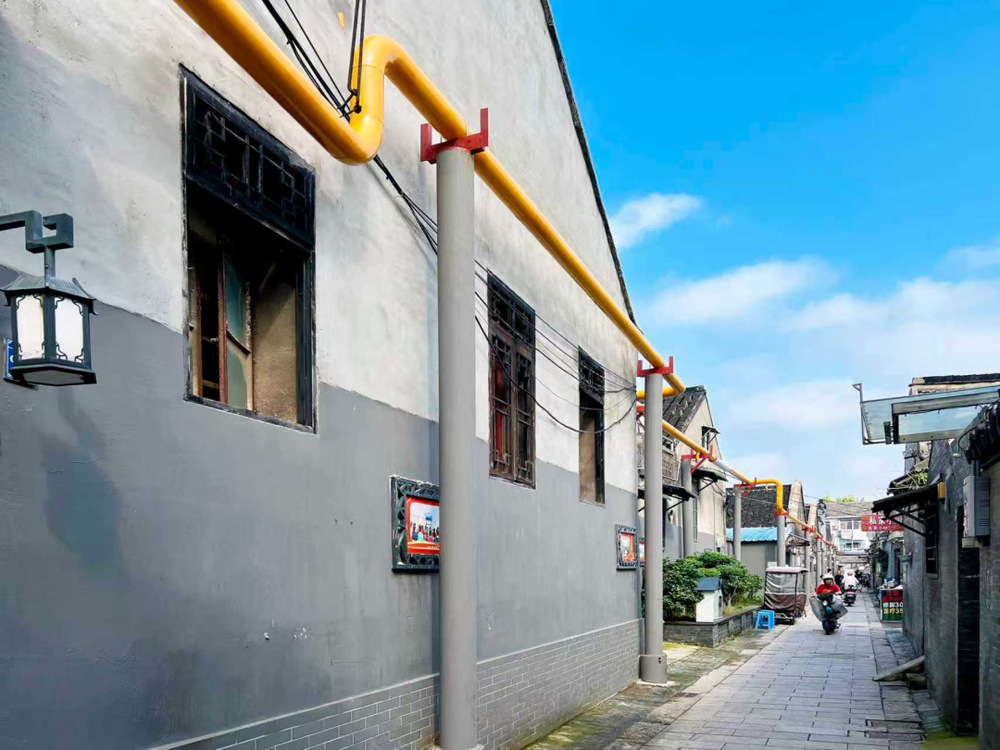 該方案通過精心設計與計算,在無法沿墻敷設管道的狹窄空間內,采用設立專用鋼結構立柱的方式,將燃氣管道穩(wěn)固地架設起來,如同為管道建造了“空中走廊”。這一方法有效規(guī)避了老建筑墻體承重不足、巷道過窄等限制,既保障了管道的安全穩(wěn)固,又最大程度減少了對原有建筑結構和街巷風貌的影響。